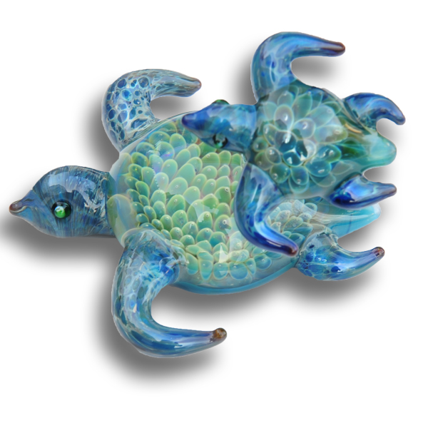 This Cremation Keepsake Paperweight is a Three Dimensional Paperweight, called A Swimming Lesson – In this paperweight the baby turtle is floating above its mother’s back. The cremains are located in a clear window in the belly of the larger turtle. Once completed, I will sign the loved one’s full name or nick name, e.g. Dad, Mom, etc. on the back of the keepsake in 22k gold, so as to be Forever in Glass.