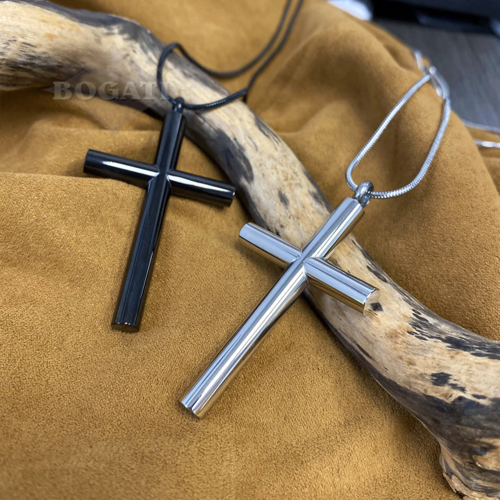 This Modern cross in silver comes with a 22” matching snake chain and double-stitched microfiber jewelry pouch.